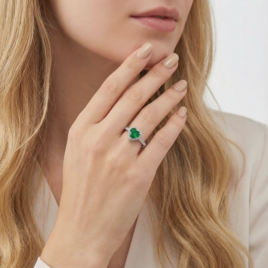 On saleHeart-cut simulated emerald ring in S925 sterling silver resting on green velvet with eucalyptus leaves.