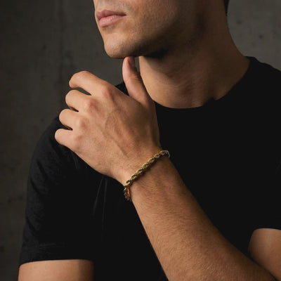 The Classic Rope Bracelet in Gold. It's crafted from durable 316L stainless steel and finished with a beautiful gold tone. This bracelet adds a subtle touch of class to any look.