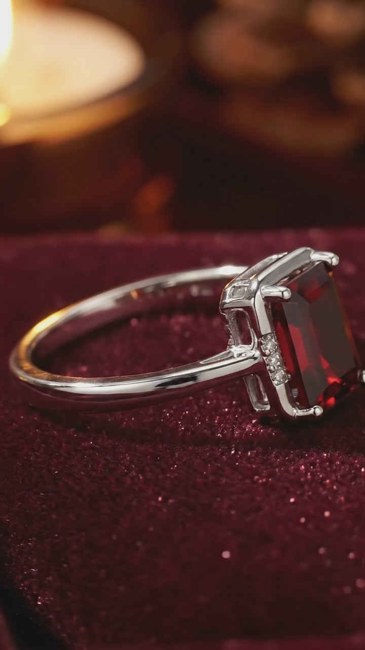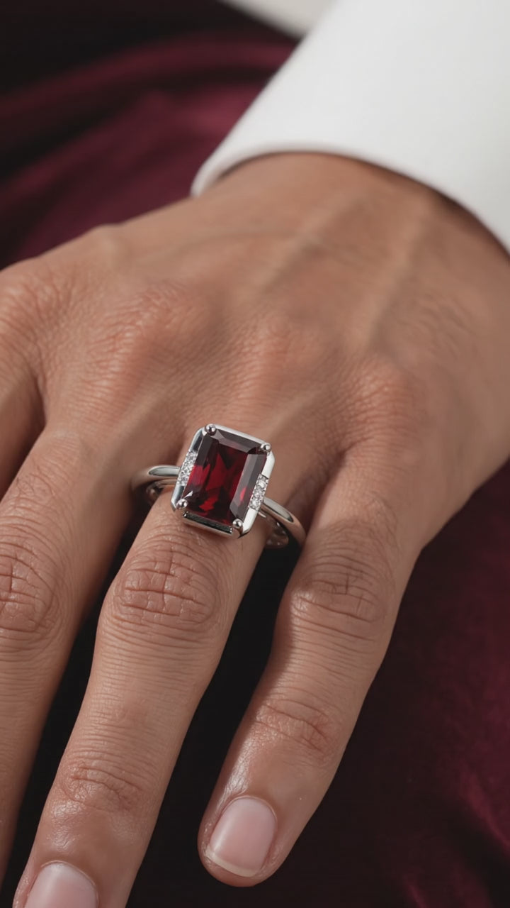Nature rarely delivers the perfect deep red garnet without heavy inclusions or cloudy patches. We engineered the solution. This ring features a precision-cut Simulated Garnet, color-calibrated to match the museum-grade saturation of the finest January birthstones. The emerald-cut facets are designed for maximum light return and deep, consistent color from every angle.