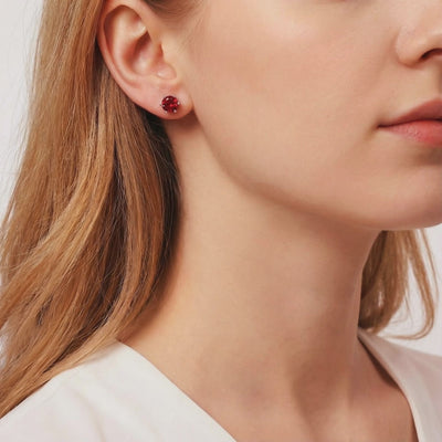 Mined rubies are notorious for internal cracks and brown undertones. We engineered a better way. These stud earrings feature Simulated Ruby, color-calibrated to match the rare "Pigeon Blood" red benchmark. Every stone is precision-cut from A5-grade material to ensure maximum light return and intense fire.