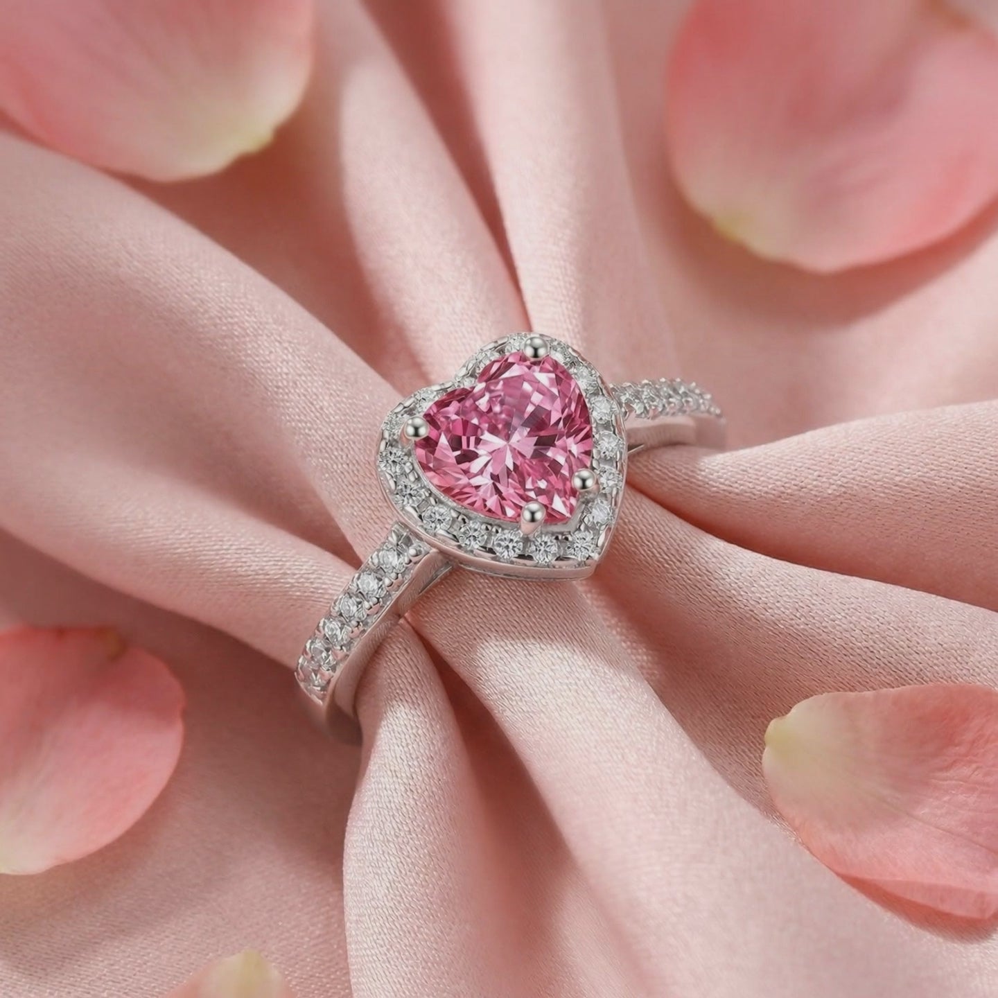 Mined tourmaline is frequently clouded by inclusions or lacks consistent color. This ring features Simulated Pink Tourmaline, color-calibrated to achieve a vivid pink tourmaline with warm raspberry brilliance and exceptional clarity. Precision-cut into a heart shape from A5-grade material, it is engineered for maximum light return and internal fire.