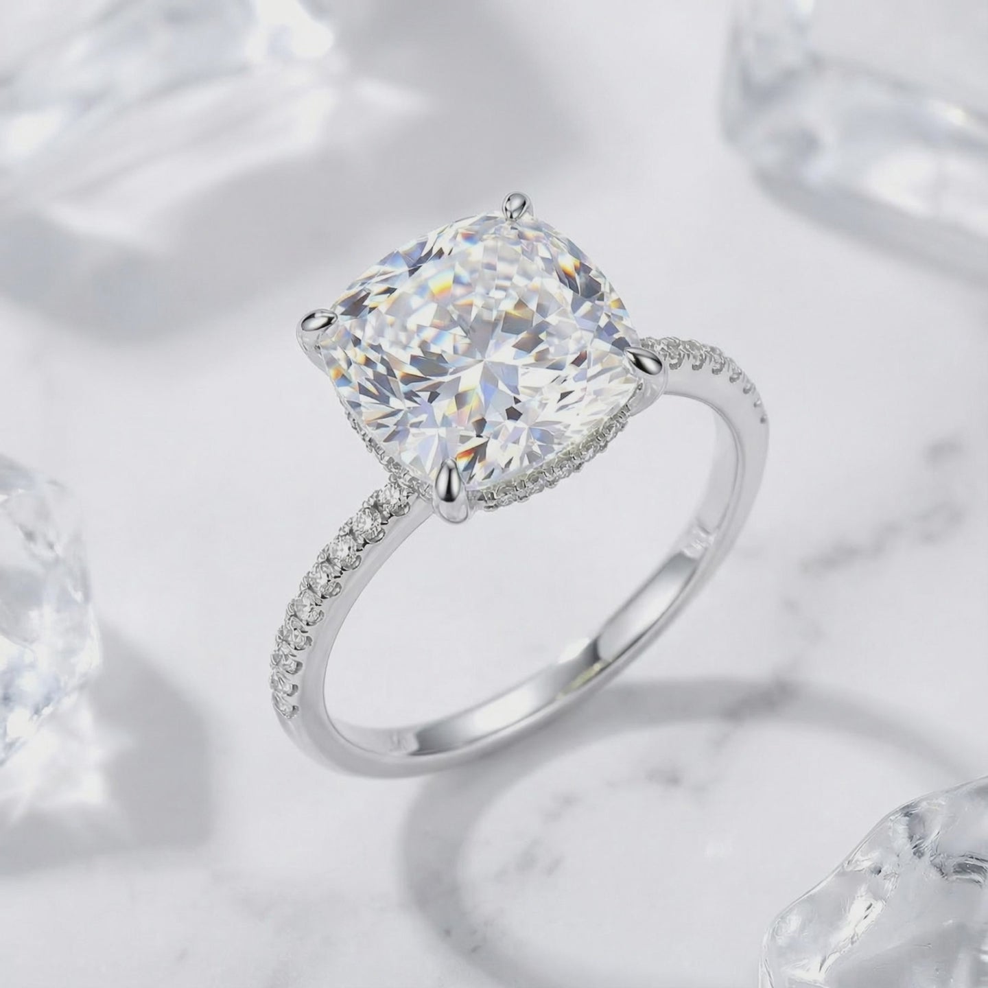 - Center Stone: 10x10mm Cushion Cut 5A Zirconia (Simulated Diamond)