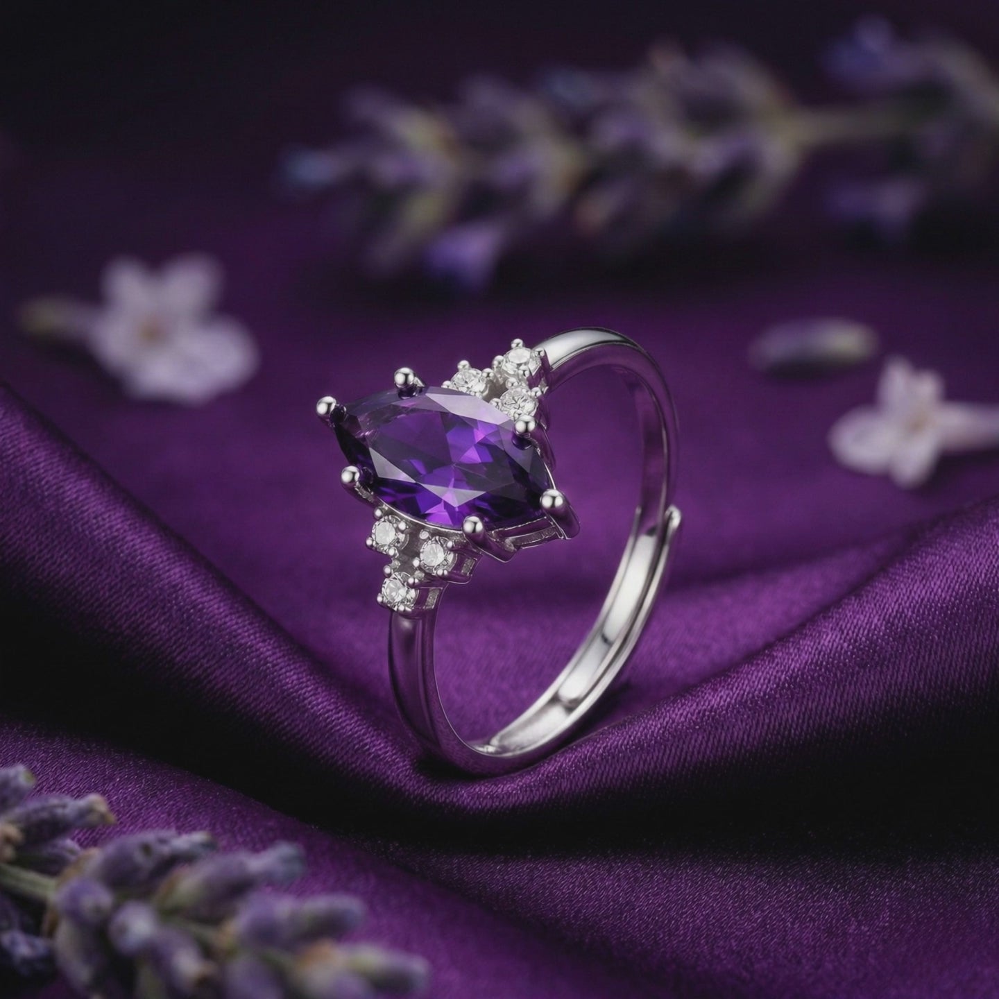 Radiate the regal elegance of the ages with The Cressida Ring. At its heart lies a breathtaking 100% Natural Amethyst, precision-faceted in a stunning Marquesa Cut (7x13mm) to maximize light return and eliminate the windowing found in lesser stones. This deep, saturated violet gem serves as a daily anchor of calm and clarity, bridging the gap between geological wonder and artisan craftsmanship.