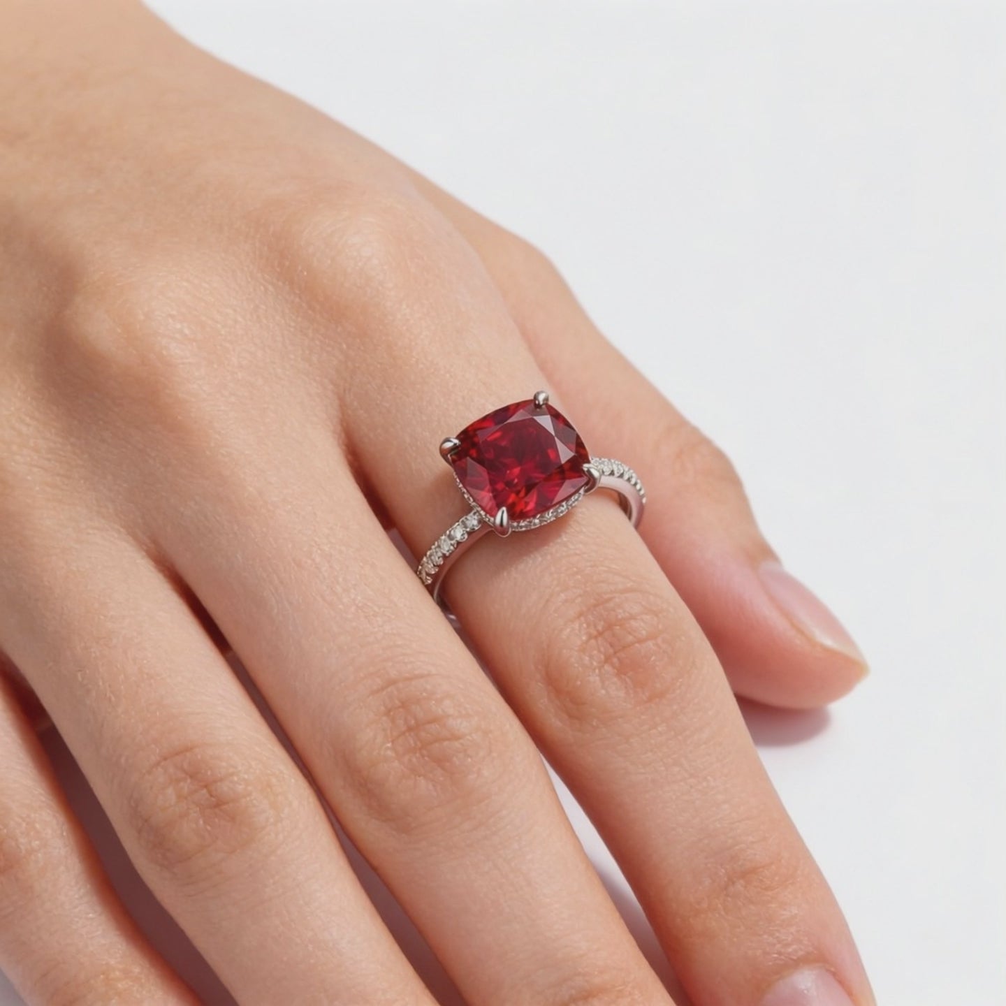 - Center Stone: 10x10mm Cushion-Cut Simulated Ruby (A5 Grade Zirconia).