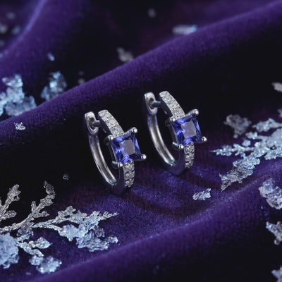 Natural tanzanite is famously rare and often plagued by inclusions that dull its natural fire. These hoop earrings feature precision-engineered Simulated Tanzanite, color-calibrated to match the coveted deep blue-violet with trichroic shifting hues found in museum-grade stones. Each square-cut stone is faceted for maximum light return, ensuring a constant play of color with every movement.