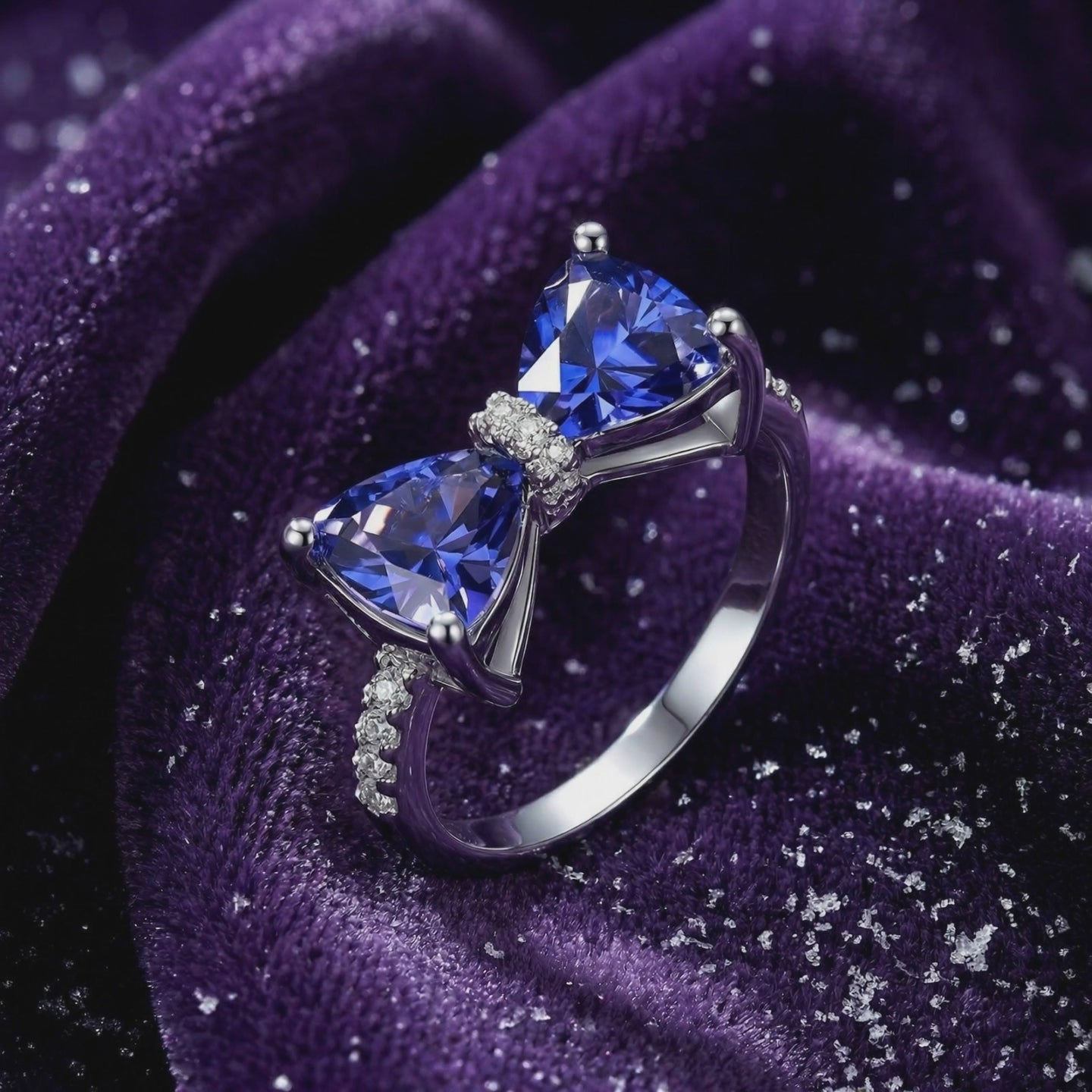 Mined tanzanite is exceptionally rare and often comes with a steep "scarcity tax" for museum-grade color. We engineered the perfect alternative. This bow-inspired ring features two trillion-cut Simulated Tanzanite stones, color-calibrated to capture the deep blue-violet tanzanite with trichroic shifting hues of the world's finest specimens.