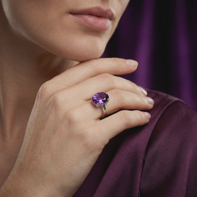 Radiate an aura of absolute majesty with this breathtaking statement ring, featuring a massive 11x16mm Natural Amethyst. The deep, saturated violet hues of the stone are maximized by a precision Oval Cut, designed to capture and refract light with mesmerizing brilliance. This is not merely jewelry; it is a wearable masterpiece that echoes the grandeur of royal heirlooms.