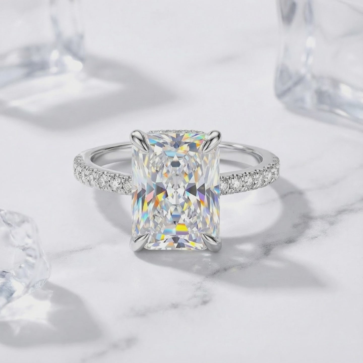 Nature rarely delivers the flawless clarity and geometric precision required for a truly impactful radiant cut. We engineered it. This April birthstone ring features a high-performance Simulated Diamond, color-calibrated to match the d-color grade of the world's most exclusive mined stones.
