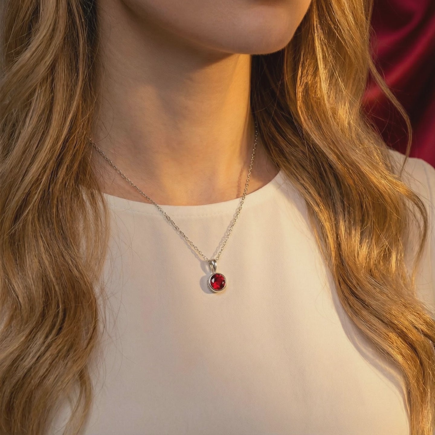 Mined rubies are often inconsistent, presenting with cloudy inclusions or a brownish tint. This July birthstone necklace features a high-performance Simulated Ruby, engineered to match the coveted "Pigeon Blood" red benchmark. Precision-cut from A5 Grade material for maximum light return and intense fire.