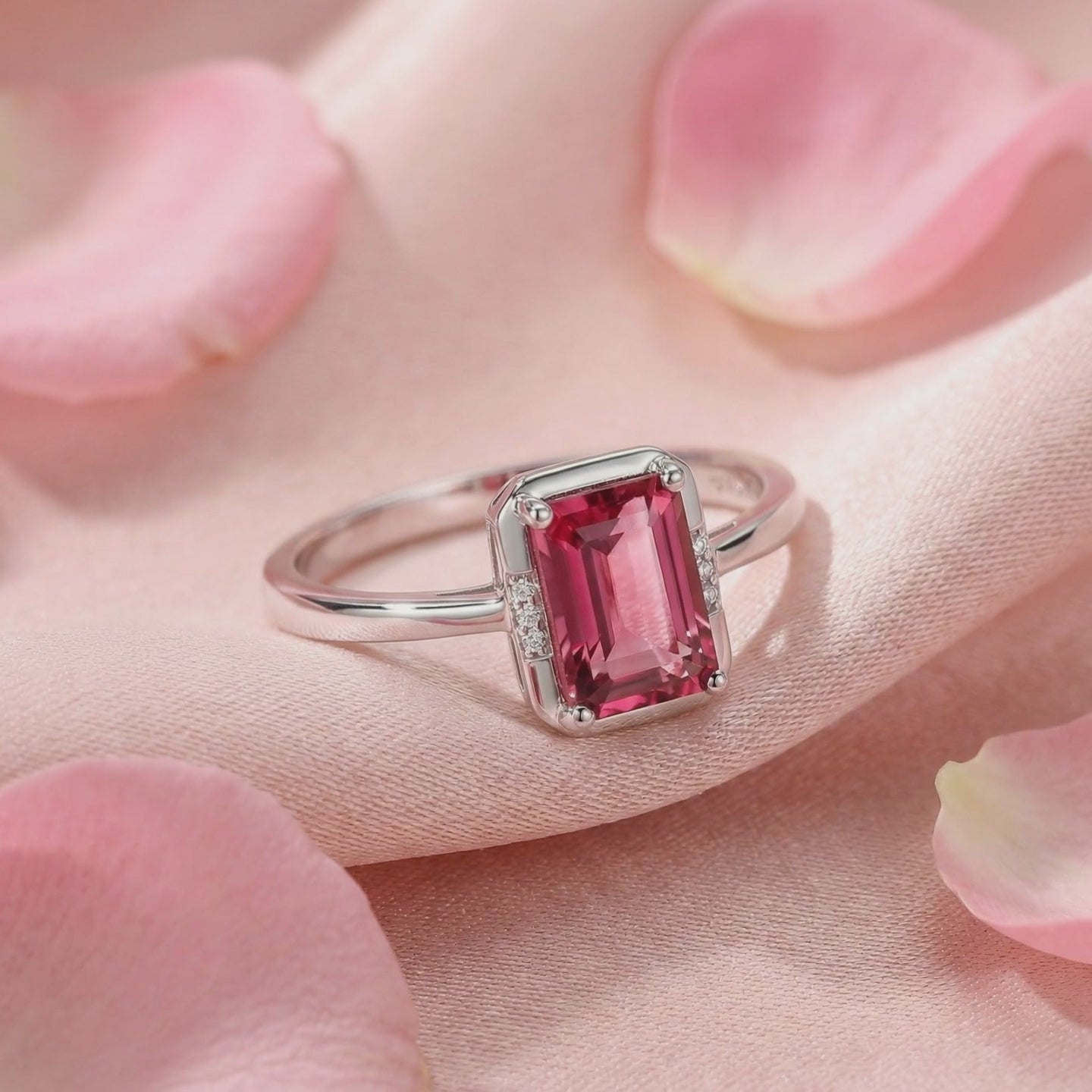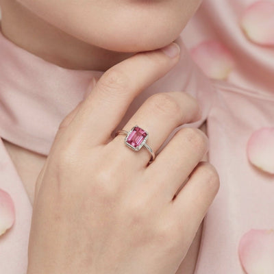 - Center Stone: 6x8mm Emerald Cut Simulated Pink Tourmaline (A5 Grade)