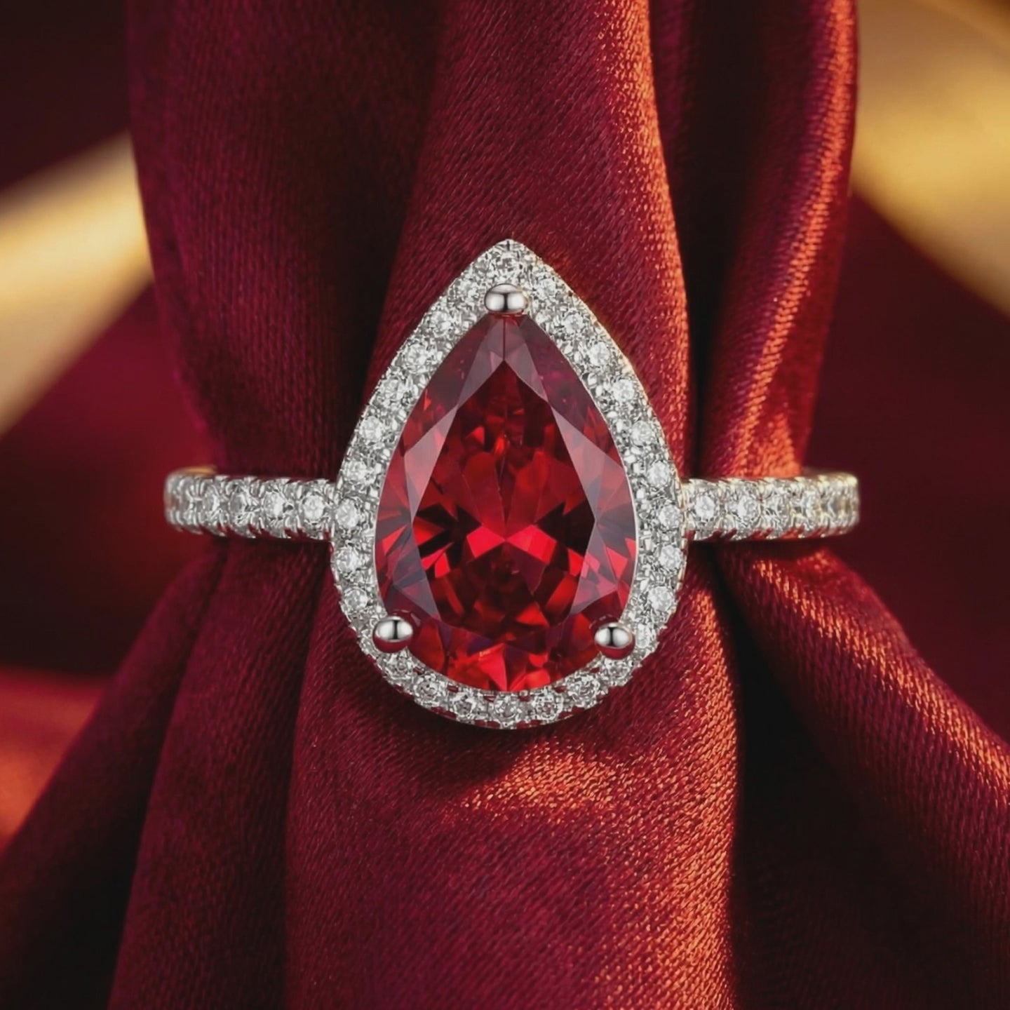 - Center Stone: High-Performance Simulated Ruby (Pear Cut)