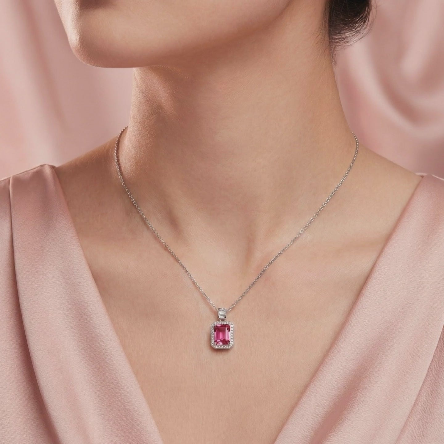 Mined pink tourmalines are often cloudy or contain distracting internal flaws. This simulated pink tourmaline necklace is color-calibrated to achieve a deep, warm raspberry brilliance and flawless clarity every time. The emerald cut is precision-engineered for maximum light return, mimicking the visual physics of a museum-grade gemstone.
