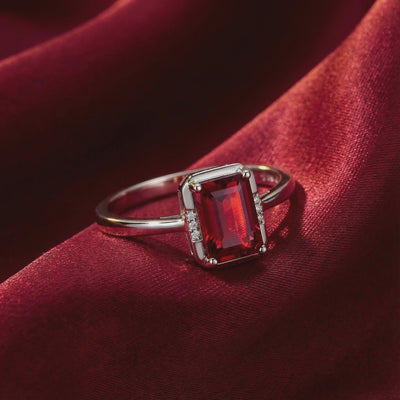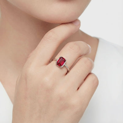 Nature rarely delivers the perfect shade of red, often leaving mined stones cloudy or brownish. This emerald-cut ring features a Simulated Ruby, color-calibrated to achieve the prestigious "Pigeon Blood" benchmark with flawless VVS clarity and intense internal fire.