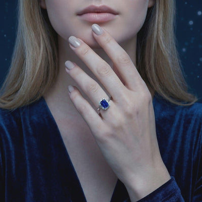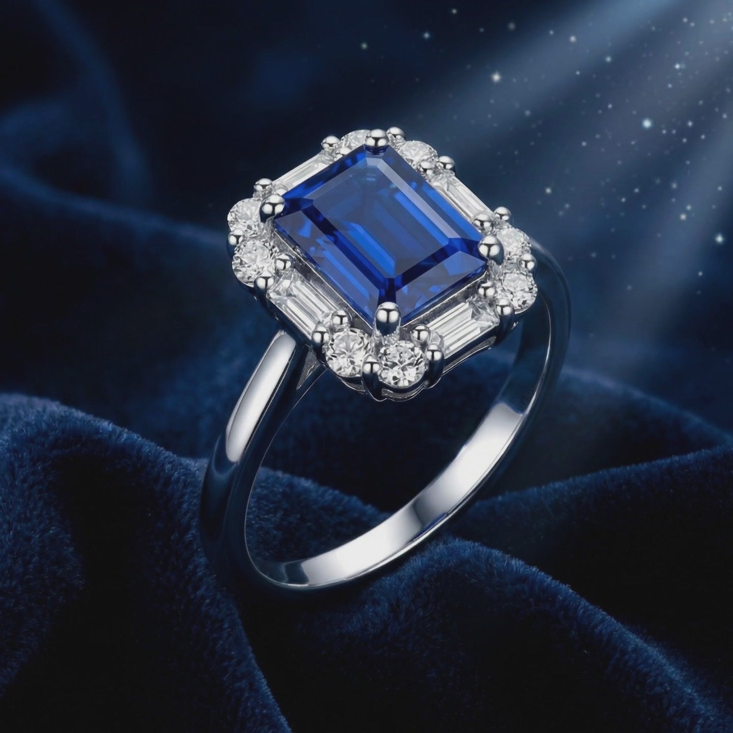 Mined sapphires are often clouded by inclusions or inconsistent in color. This September Birthstone ring features a precision-cut Simulated Sapphire, engineered to replicate the coveted "Royal Blue" benchmark with velvety saturation and flawless clarity. The central octagon emerald-cut stone is surrounded by a halo of brilliant-cut accents and flanked by baguette-cut stones to maximize light return and architectural fire.