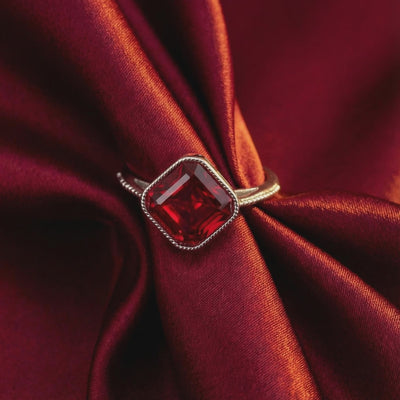 - Center Stone: 8mm Square-Cut Simulated Ruby (A5 Grade)