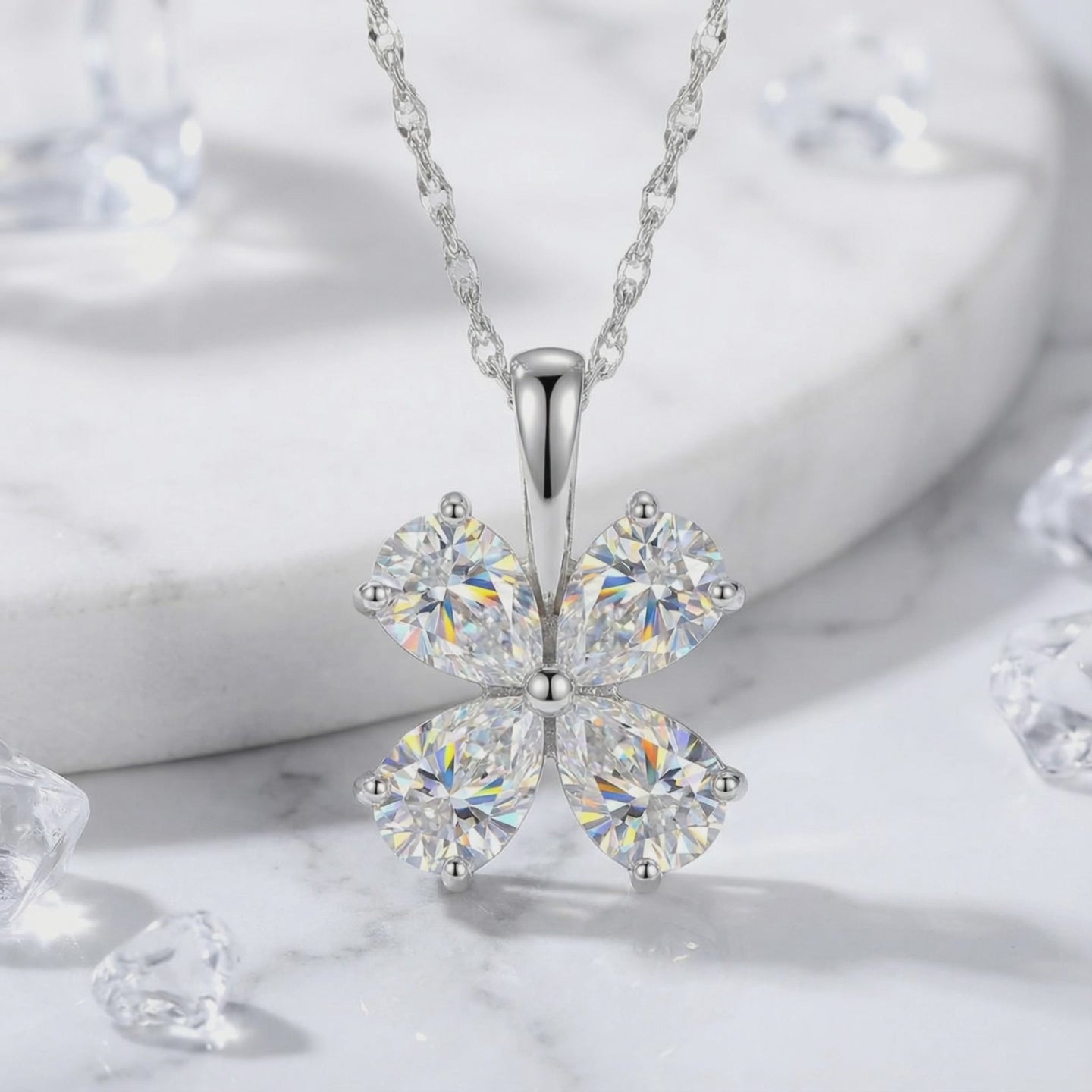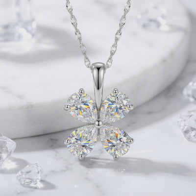 Nature rarely delivers perfection, so we engineered it. This April birthstone necklace features four precision-cut pear stones, arranged in a flawless four-leaf clover silhouette. Crafted with 5A Zirconia, these stones simulate the brilliance of a diamond, delivering exceptional sparkle and clarity.