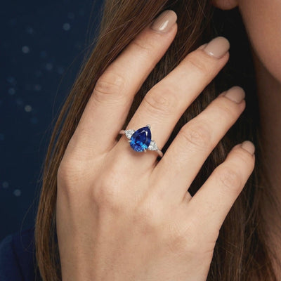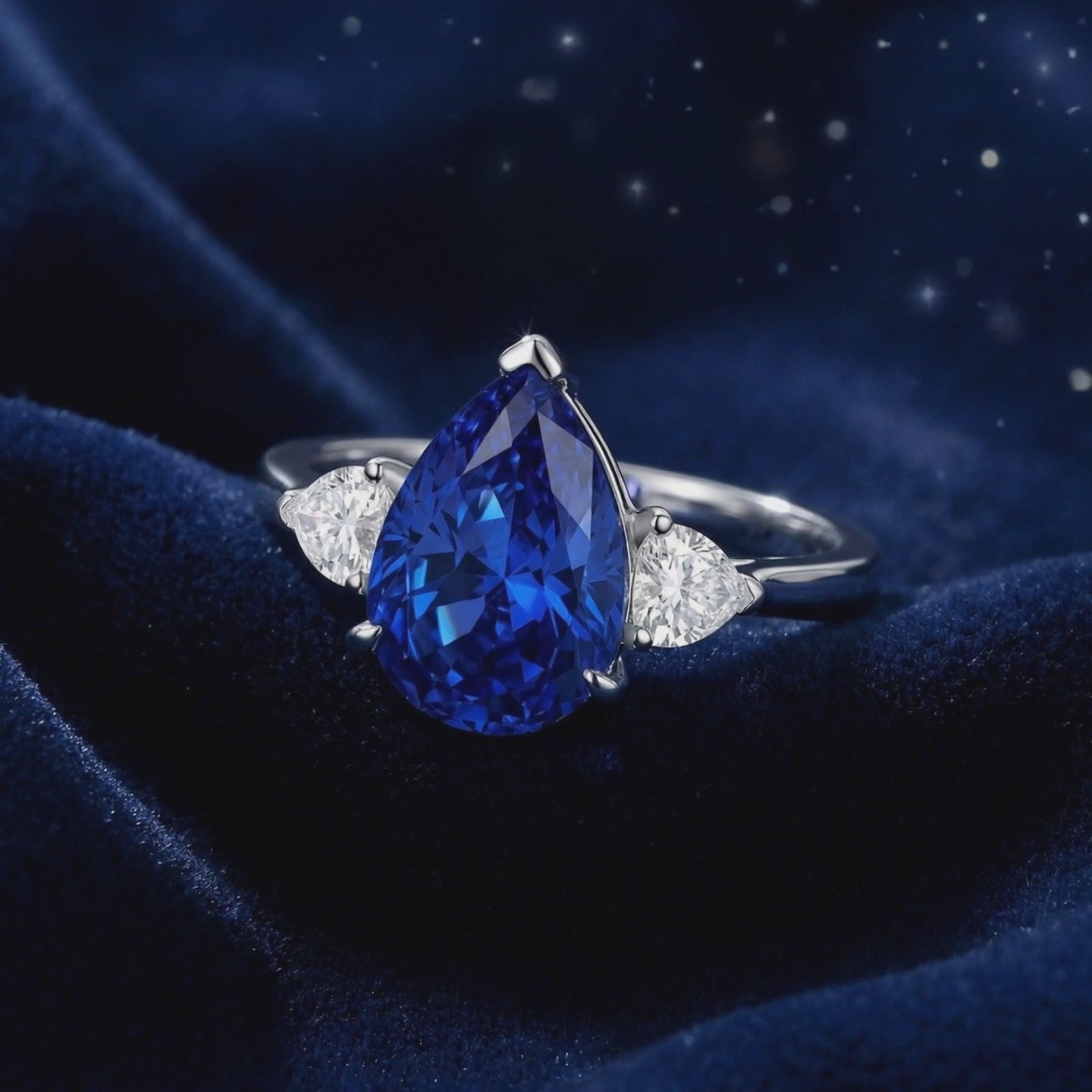 Nature rarely produces the perfect royal blue. This September birthstone ring features a precision-cut Simulated Sapphire, engineered to match the coveted velvety saturation of museum-grade gems. The pear-cut center stone is flanked by brilliant trillion-cut accents, creating a high-impact profile that replicates the visual physics of a $5,000 heirloom.