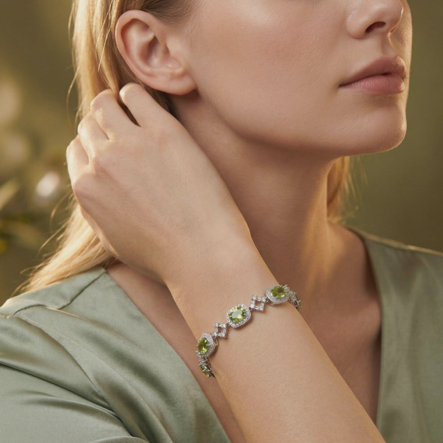 Wrap your wrist in the vibrant energy of the sun. This exquisite station bracelet features five luminous Oval Cut Natural Peridot gemstones, each one selected for its electric olive-green hue and exceptional clarity. Known as the "Evening Emerald," these stones refuse to dim when the lights go down, maintaining their radiant glow from your morning coffee to your evening gala.