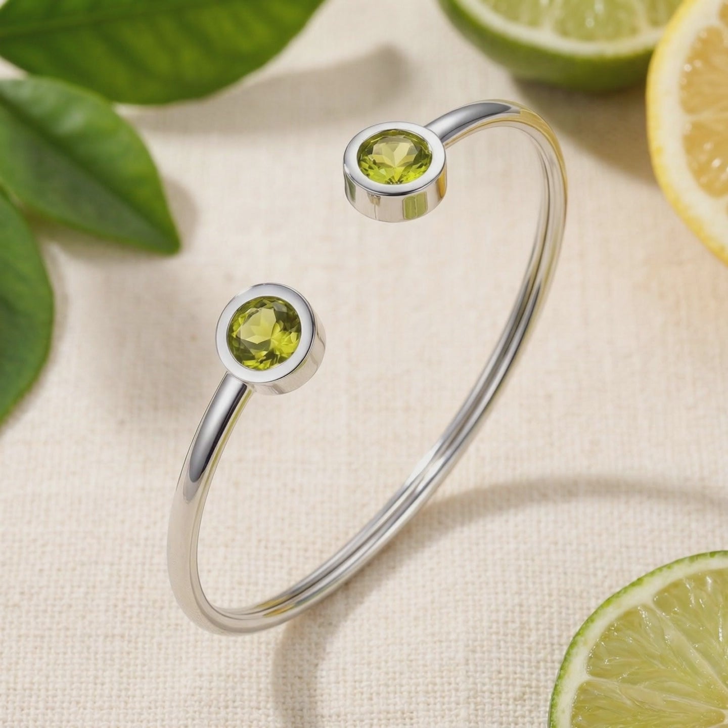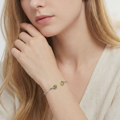 Nature rarely produces a peridot with this level of clarity and consistent yellow-green vibrance. We engineered it. This bracelet features two precision-cut Simulated Peridots, color-calibrated to match the ideal museum-grade benchmark. The open cuff design provides a low-profile aesthetic and a custom fit, resisting snags while maintaining daily durability.