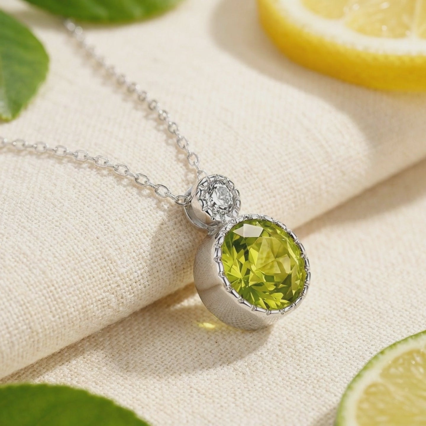Nature rarely delivers the perfect shade of green. Mined peridot is often plagued by muddy undertones and internal inclusions that dull its natural light. We engineered the solution. This necklace features a Simulated Peridot, color-calibrated to achieve the absolute ideal vibrant yellow-green benchmark with flawless VVS clarity.