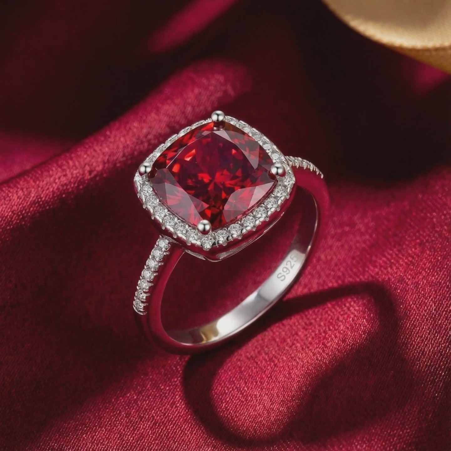 Mined rubies often suffer from internal inclusions that cloud their natural fire. This July birthstone ring is engineered using A5 Grade Simulated Ruby, color-calibrated to match the prestigious "Pigeon Blood" red benchmark. The center cushion-cut stone is surrounded by a precision-cut halo, designed to maximize light return and provide the visual impact of a museum-grade heirloom.