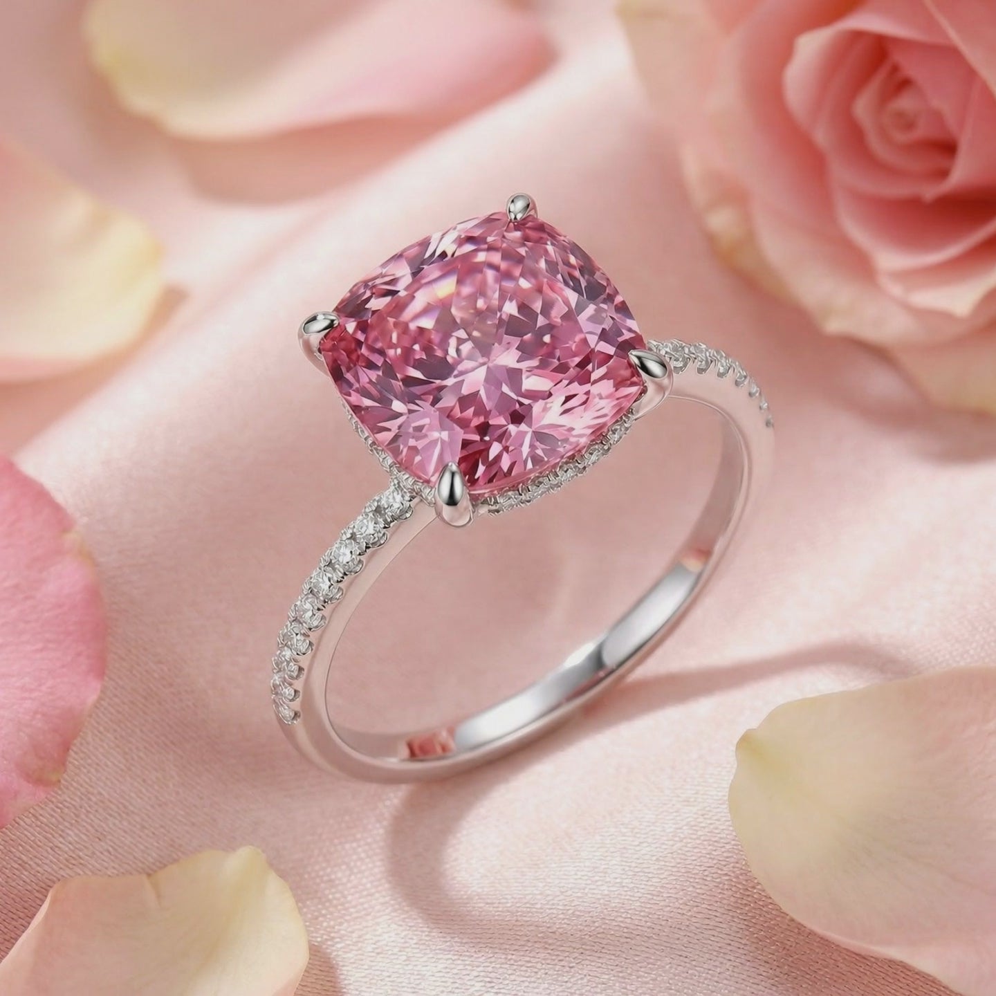 Nature rarely delivers perfection, so we engineered it. This October birthstone ring features a precision-cut Simulated Pink Tourmaline, color-calibrated to achieve a deep raspberry brilliance that mined stones rarely match. The 10x10mm cushion-cut center stone is surrounded by a micro-pave hidden halo and band, designed for maximum light return and a museum-grade profile.
