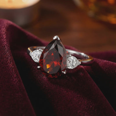 Nature rarely produces a garnet with this level of clarity and deep red saturation. We engineered it. This Simulated Garnet provides the visual physics of a museum-grade gemstone without the common cracks or the mining markup found in Earth-mined stones. This ring features a precision-cut pear-shaped center stone, meticulously calibrated for maximum brilliance and light dispersion.