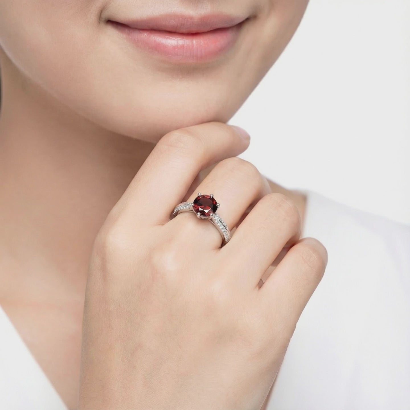 Mined garnets often suffer from inconsistent brown undertones. This January birthstone ring features a precision-cut Simulated Garnet, engineered to achieve the ideal "blood red" saturation of a museum-grade stone. Each facet is calibrated for maximum light return, ensuring this ring outperforms natural stones that cost ten times as much.