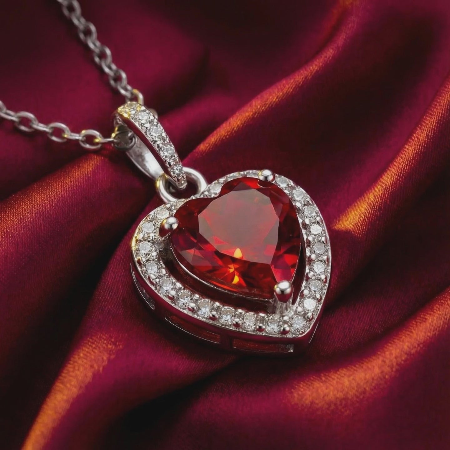 Mined rubies are often cloudy, fractured, and carry brown undertones. This heart necklace features a Simulated Ruby, color-calibrated to match the rare and coveted 'Pigeon Blood' red benchmark. We have engineered the optical clarity nature rarely delivers, ensuring every facet captures and throws light with intense fire.