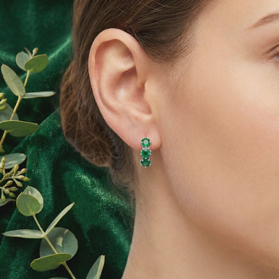Mined emeralds are notoriously brittle and filled with internal inclusions that compromise their beauty. We engineered a better way. These huggie earrings feature three star-cut Simulated Emeralds, color-calibrated to match the deep forest green benchmark of the world's finest stones without the structural flaws.