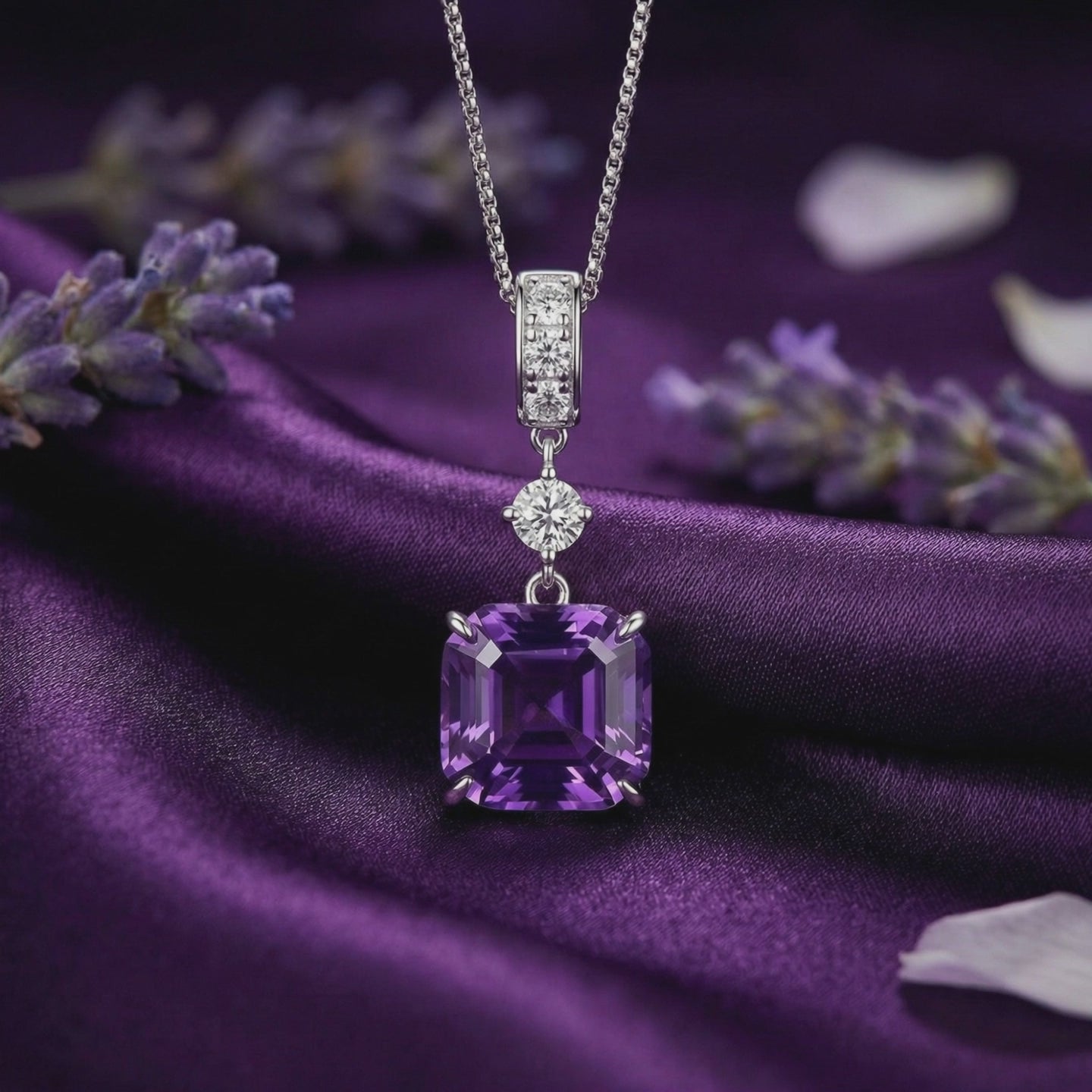 Command the room with the deep, saturated violet of this massive 7-carat Natural Amethyst. Precision-faceted in a bold Square Cut to maximize light return, this pendant necklace captures the geological wonder of the earth, offering a window into deep serenity and clarity.