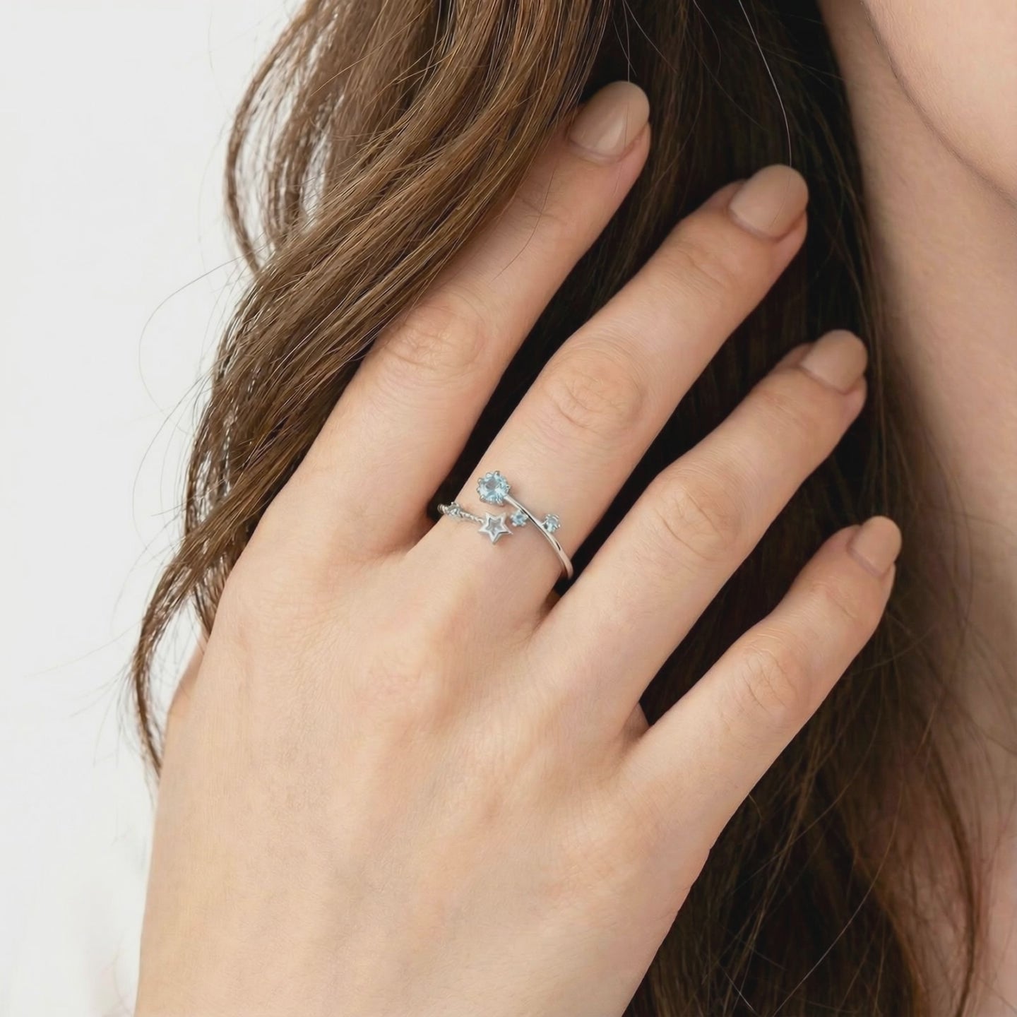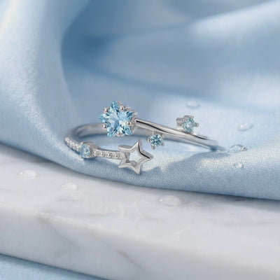 Nature rarely delivers the perfect shade of light blue aquamarine without inclusions. We engineered it. This March birthstone ring features precision-cut simulated aquamarine stones, color-calibrated to achieve museum-grade saturation and VVS clarity. The bypass design creates a celestial silhouette of stars across the finger, offering the visual physics of high-end heritage jewelry without the mining markup.