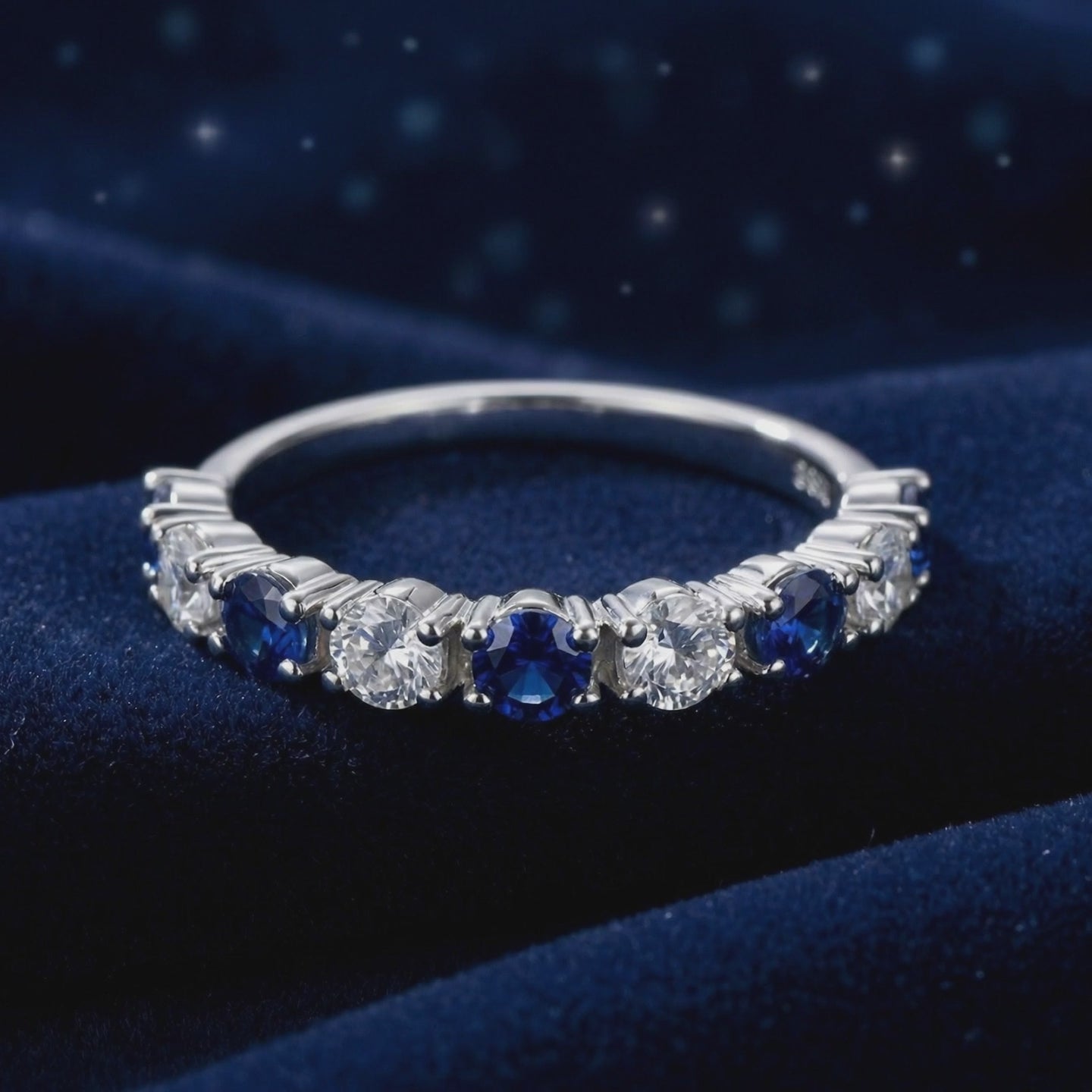 Mined sapphires are often plagued by cloudy inclusions and uneven color distribution. This ring features Simulated Sapphire, engineered to match the coveted 'Royal Blue' benchmark with velvety saturation. Each of the seven stones is precision-cut from A5 Grade material for maximum light return and optical fire, delivering a visual profile that nature rarely achieves consistently.