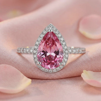 - Cut: Precision-Faceted Pear Cut with Halo Accents