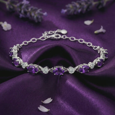 Wrap your wrist in the deep, velvety purple of twilight with The Verona Oval Bracelet. This exquisite station bracelet features seven precision-faceted, 100% Natural Amethyst gemstones, each cut into a classic oval shape (4x6mm) to maximize color saturation and brilliance. The stones are spaced rhythmically along the chain, creating a continuous dance of violet fire that catches the light from every angle.