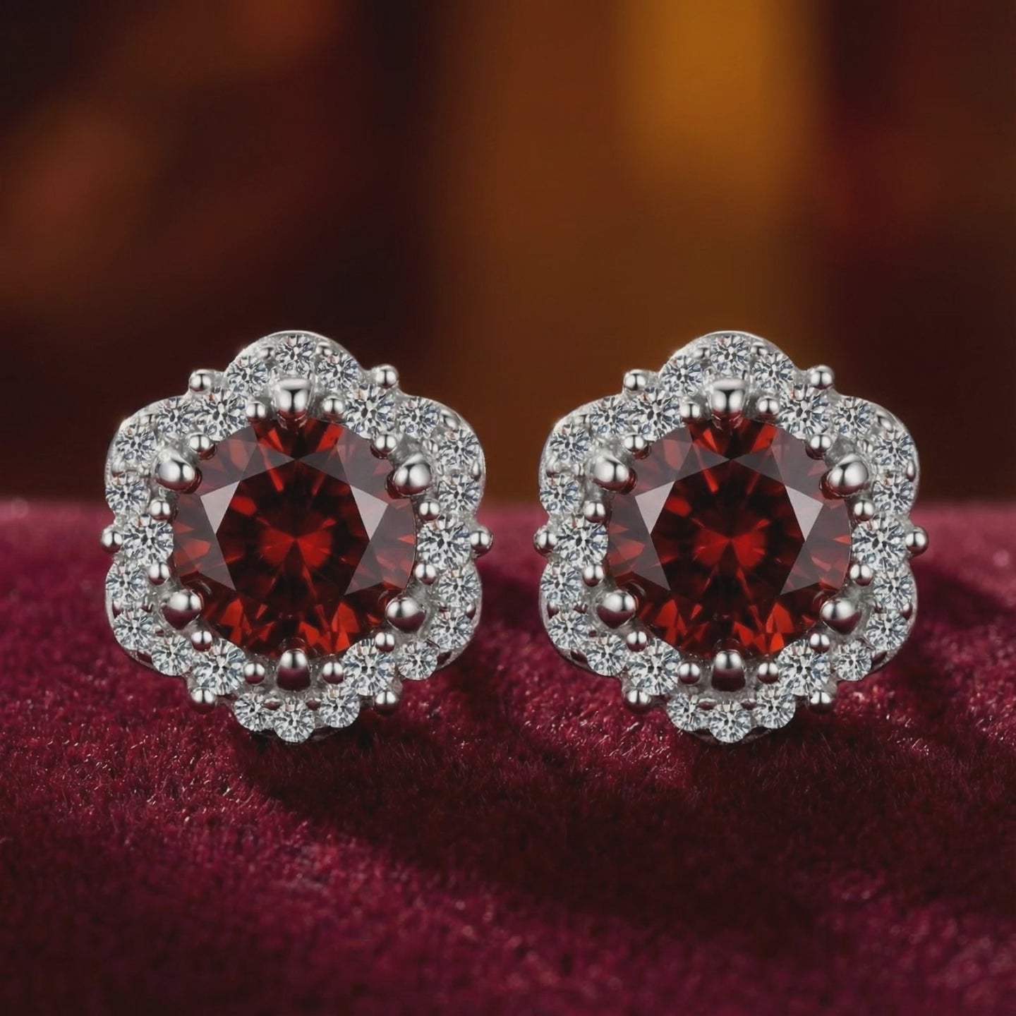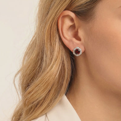 Mined garnets are often inconsistent and prone to internal inclusions. These halo stud earrings feature a Simulated Garnet, engineered to match the coveted deep, volcanic red of a museum-grade January birthstone. Each stone is precision-cut from A5 Grade material for maximum light return and optical supremacy.