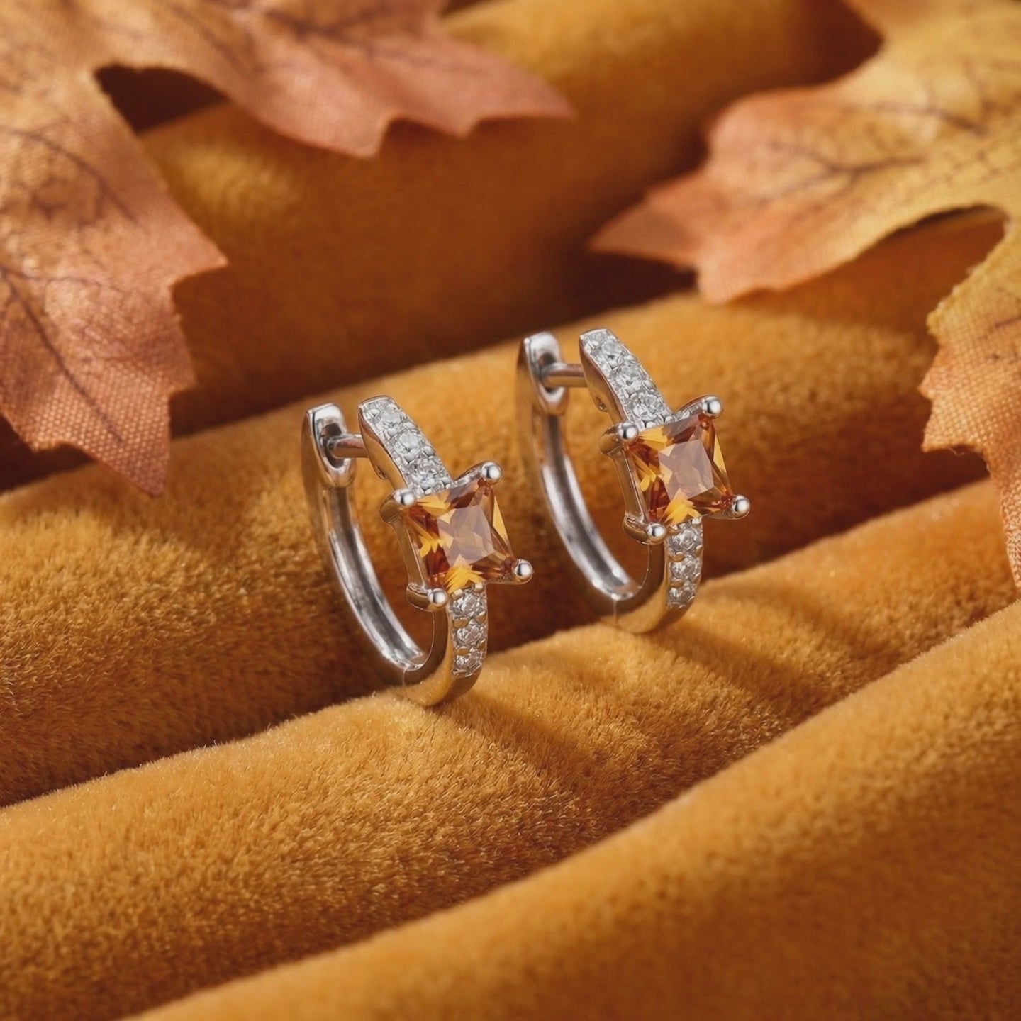 Mined topaz is often pale or inconsistent. These huggie earrings feature Simulated Topaz, color-calibrated to achieve a deep, warm golden/orange topaz with honeyed warmth. Each stone is square-cut to maximize light return and brilliance, flanked by precision-set accents for a high-impact profile.
