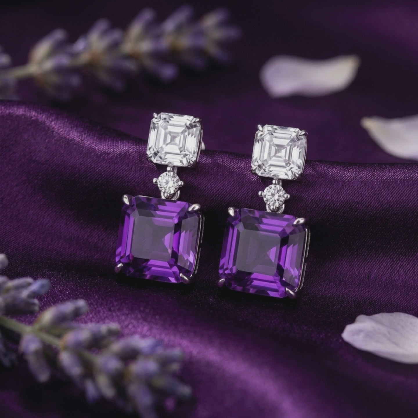 Showcase the breathtaking depth of the earth with these massive 12-carat total weight Natural Amethyst earrings. Each 10mm stone features a precision Square Cut, engineered to maximize saturation and eliminate the "windowing" often found in lesser gems, resulting in a deep, velvety violet hue that captures light from every angle.